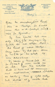 2 L.A.S. "Edvard Munch", [1930s, to Johs ROEDE] ; 2 pages in-8 each, hotel headers ; in Norwegian. — Interesting letters to his lawyer. [Johs ROEDE (1875-1958) was Munch's lawyer ; a great collector himself, he was the brother of Halfdan Nobel ROEDE (1877-1963), a pianist, composer, film producer and director, and theatre director, a great art lover, who collected Munch's paintings, whose works he exhibited in his theatres and cinemas] — Opdal (Opdal Turisthotel). He complains of economic difficulties, despite his apartments, which he wants to rent or sell... He also wants to move to see more space... — Göteborg (Grand Hotel Haglund). He bought [in 1916] his property in Ekely 55.000 crowns, it was too expensive. He contacted his childhood friend the architect Henrik Bull, who thinks it is worth hardly more than 60.000 now. He reports a conversation with Jens THIIS (director of the National Gallery in Oslo) about his bad reputation : he is called a big landlord, and the rumour grows that he neglects his paintings and keeps them in bad conditions...