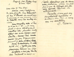L.A.S. "C. Pissarro", Éragny 8 May 1890, to Théo VAN GOGH ; 1 page and a half in-8. — He asks his dealer to collect for him from Blanchet in rue Saint-Benoît "a frame of engravings and a gouache back from Nantes". He will come to Paris on the 10th or 11th : "I bring you some objects that I would like to sell. Being on my way to London, I would have liked to have a little money to be able to make some studies there. We will talk about your visit here, I hope we can find a joint. Business must not have been very good this month. I hope however that luck will favor us a little more and that the tempera I bring you will find an enthusiast!