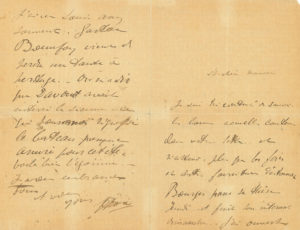 L.A.S. "Henri", [Paris January 1891], to HER MOTHER, Countess Adèle de TOULOUSE-LAUTREC ; 4 pages in-8 (some cracks in folds repaired). — On an exhibition and sale of paintings. — He is happy to have good news from her, and is "only waiting for livers and other stomach supplies". — His friend Henri Bourges is doing his thesis "and finishing his internship on Sunday. Yesterday I opened the Volney exhibition [at the Cercle artistique, rue Volney]. My paintings are not too badly placed, but in a light that is not as good as last year's. I sold two studies of dancers to MANZI, head of the Goupil gravure printing house. [...] I have not yet had Papa's trinkets transported, having waited for the Caulaincourt iceboxes to melt, which will be done today or tomorrow. Paris was shaken by the detonation of melinite intended to burst the ice on the Seine. Bourges even saw two swans carried away by the ice cubes, fluttering weakly between two bridges, and falling back exhausted on the ice". — He adds that "Gaston Bonnefoy has just lost an aunt to heritage. - I was told that Davout had buried his - which could mean the boat almost assured for this summer. That's selfishness for you"... — Correspondence (ed. Herbert Schimmel, 1992), no. 185, p. 169.