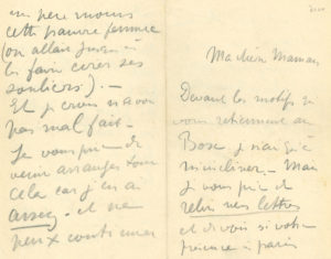Devant les motifs qui vous retiennent au Bosc je n'ai qu'à m'incliner. - Mais je vous prie de relire mes lettres et de voir si votre présence à Paris n'était pas clairement indiquée, car vous ne pouvez rester indéfiniment spectatrice d'un état grave [allusion à sa tante Armandine malade] il est vrai tandis que votre présence ici est urgente. J'ai dû avancer à ma tante 100 F pour payer des raccomodages indispensables», qu'il demande qu'on lui renvoie par retour. De plus j'ai autorisé ma tante et ses fils à chercher dans les 300 F par mois un couvent ou family hotel où on torturera un peu moins cette pauvre femme (on allait jusqu'à lui faire cirer ses souliers). - Et je crois n'avoir pas mal fait. Je vous prie de venir arranger tout cela, car j'en ai assez, et ne peux continuer à pallier une ligne de conduite que je trouve trop rigide. Le couvent c'est bien mais pas trop n'en faut»...