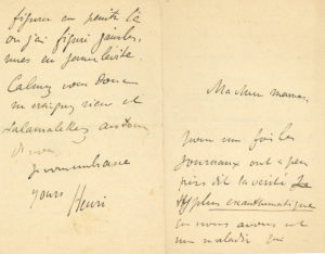 L.A.S. "yours Henri", [Paris end of April 1893], to HER MOTHER, Countess Adèle de TOULOUSE-LAUTREC ; 4 pages in-8. "My dear Mother, For once the newspapers have pretty much told the truth. The exanthematic typhus that we have is a disease that can only attack people who are poorly fed and locked up in prisons or colleges. We happier people are safe from this very limited epidemic. I am always lazy and wait for inspiration. I walk in the woods every day and take in as much oxygen as I can. I almost took the train and went to spend a week in Taussat but I was afraid I would not be able to come back. — I will be happy to look for a decoration for the Rochegude Museum [Hotel de Rochegude, in Albi] and it would be funny to appear as a painter where I appeared bare-legged as a young Levite. — So calm down, don't be afraid of anything, and say hello to those around you... — Correspondence (ed. Herbert Schimmel, 1992), no. 292, p. 226.