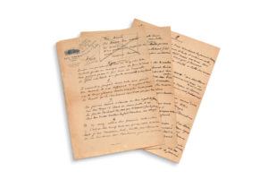 14 quatrains en vers alexandrins (sur 15) aux rectos de 3 feuillets in-4 (237 x 207 mm) sur papier à lettres à en-tête imprimé en bleu du «Café Terminus / Gare Saint-Lazare / Paris», à l'encre noire, avec le titre «Adieux» ainsi que deux modifi cations de mots de la main d' Apollinaire : 1er quatrain, vers 1 : ajout ‘futurs (barré) nouveaux» ; 5ème quatrain, vers 2 : «longtemps» au lieu de «à toutes». Il manque le dernier quatrain, lequel devait sans doute figurer sur un quatrième feuillet. Au verso du troisième feuillet, le dessinateur et ami d'Apollinaire, André Rouveyre, a inscrit ces mots tardifs au stylo à bille bleu se rapportant au présent poème : «Apollinaire aimait les gares, les endroits où on se rencontre... où on se quitte... les brasseries... Bien de ses poèmes il les écrivait là...