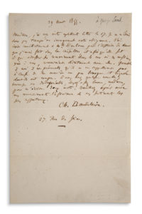 BAUDELAIRE Charles (1821-1867) — Lettre autographe signée à George SAND, «19 août 1855»,1 p. — autographe à l'encre brune sur 1 f. double in-8 de papier vélin ivoire. — Légères traces de pliure. — Belle lettre adressée à George...