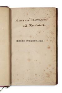 [BAUDELAIRE CHARLES] (1821-1867) — POE Edgar, Histoires extraordinaires. — Paris, Michel Levy, 1856, in-12, demi-maroquin bordeaux à coins, dos tiré or à cinq nerfs tête dorée (David). — Quelques rousseurs aux premières pages.
