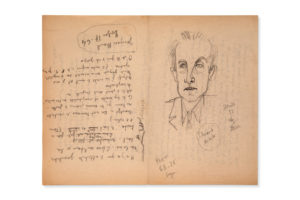 COCTEAU Jean (1889-1963) — Portrait de Paul Éluard, dessin original et manuscrit autographe signé Jean COCTEAU, [vers 1942] ; mine de plomb, 15 x 9 cm, sur un feuillet in-4 écrit recto-verso. — Étonnant portrait de Paul Éluard, avec un...
