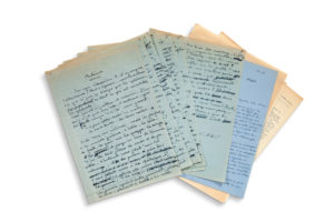 COLETTE GABRIELLE SIDONIE (1873-1954) — Automne, manuscrit autographe ; 7 pages in-4 à l'encre sur papier bleu, nombreuses ratures et corrections. — Texte édité dans les oeuvres complètes sous le titre Trésors épars.