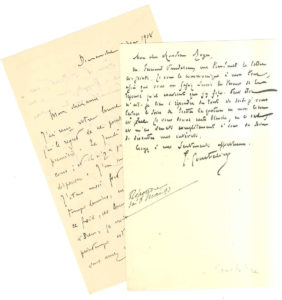 – Romain ROLLAND. Lettre autographe signée à un destinataire non identifié, S. l., 3 mai 1908. 2 p. sur 1 double f. in-12. L'auteur s'excuse de ne pouvoir se rendre à une première.
