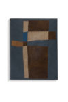 Plein box gris bleu, compositions de pièces rectangulaires de veau de différentes teintes, marron foncé, beige, blond, gris bleu et bleu pétrole, cousues à la façon d'un rapiéçage avec du fi l brun. Doublures et gardes de daim brun et bleu ciel (Monique Mathieu, 1982).