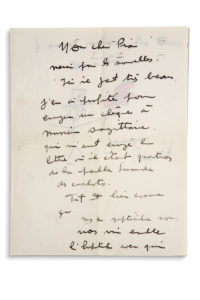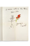 PREVERT Jacques (1900-1977) — Lettre autographe signée à Pascal PIA enrichie d'un dessin en couleurs, Antibes le 28/07/56 ; 1 page 1/2 in-4 avec enveloppe.