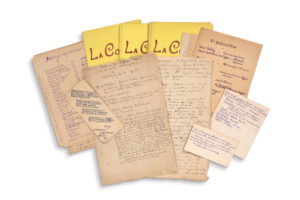 Projets de statuts, de justification et de sommaire. 3 pp. ½ petit in-4 sur 3 ff. de papier ligné, à l'encre violette et noire ; avec 2 ff. In-16 recto à l'encre violette comportant le projet de justification et de tirage de la revue, 1 f. in-8 resto à l'encre violette portant une liste de texte «en préparation», ainsi qu'un brouillon d'«ordre du jour» au crayon sur 1 f. in-8 ; (papier uniformément jauni, fatigué aux pliures avec légères déchirures).