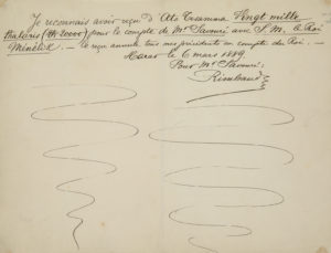 Reçu autographe à l'encre d'une écriture appliquée daté, signé et illustré par Arthur Rimbaud de lignes à l'encre remplissant la page en dessous du texte autographe.