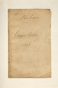 (Ensemble composé vers décembre 1891 et janvier 1892 - la première édition de Liturgies intimes : Paris, Bibliothèque du Saint-Graal, mars 1892 ; la seconde édition augmentée de 7 poèmes : Paris, Léon Vanier, 1893.) 17 poèmes autographes sur les 18 publiés dans la première édition sur 15 feuillets de dimensions variables (certains sur feuillets de souscription de Sagesse du Réveil catholique ; certains au dos de lettres ou d'enveloppes adressées au poète ; certains feuillets avec plusieurs poèmes écrits tête-bêche). Les poèmes figurant dans cette première ébauche du recueil sont : Asperges me (I), Avent (II), Noël (III), Saints Innocents (IV), Circoncision (V), Rois (VI), Kyrie Eleison (VII), Gloria in Excelsis (VIII), Credo (IX), Ascension (X), Veni Sancte... (XI), Juin (XII), Sanctus (XIII),