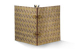 Reliure semi-souple signée de Jean de Gonet (1997). Plats de veau estampé d'un motif cannelé peint au pochoir en gris ombré sur fond alterné de jaune et de rose mouchetés.