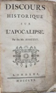 ABAUZIT (Firmin). Discours historique sur l'Apocalypse. Londres, s.n., 1770. In-8, 104 p., cart. marbré XIXe s., pièce de titre basane brune au dos (titre défraîchi, mouillures).