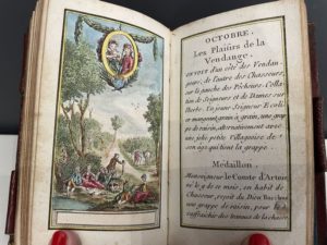 Charmant almanach orné « de 12 estampes relatives aux amusemens de la ville pendant chaque mois » et suivi « de tablettes pour écrire et dessiner tout ce que l'on désirera, en se servant de telle pointe que l'on voudra, même d'une épingle ». L'ouvrage contient également 2 frontispices, soit au total 14 planches gravées sur cuivre, coloriées.