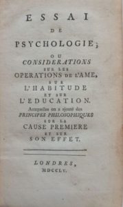 [BONNET (Charles)]. Essai de psychologie, ou Considérations sur les opérations de l'âme, sur l'habitude et sur l'éducation, auxquelles on a ajouté des principes philosophiques, sur la cause première et sur son effet. Londres, s.n., 1755. In-12, XLII-390 p., basane havane époque, dos à 5 nerfs, filets dorés, tranches mouchetées (dos passé, frottements, pièce de titre incomplète, 3 coins émoussés, auréole claire dans des marges, rousseurs).