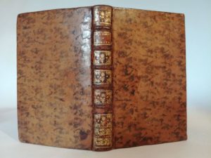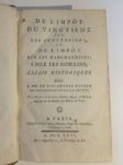 BOUCHAUD (Mathieu-Antoine). De l'impôt du vingtième sur les successions et de l'impôt sur les marchandises chez les Romains. A Paris, chez De Bure père, 1766. In-8, XVI-482 p., [1] f. (privil), veau havane moucheté de l'époque, dos à 5 nerfs, pièce de titre veau fauve, caissons ornés aux petits fers, filet doré aux coupes, tranches rouges (2 coins émoussés, découpe au coin d'une garde, piqûres de rouilles sporadiques).