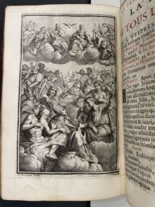 Frontispice de Hallé gravé par P. Landry et 11 gravures sur cuivre à pleine page représentant le roi David, l'Annonciation, la Nativité, la Pâques, l'Ascension, la Pentecôte, la Trinité, le Saint Sacrement, Saint Augustin, Sainte Ursule, la Toussaint.