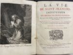 - CHALIPPE (Candide). La vie de saint François, instituteur de l'Ordre des Frères mineurs, de celui de sainte Claire et du Tiers ordre de la Pénitence A Paris, chez P. Prault, 1728. In-4, [4] f., LII-714 p., front., veau havane époque, dos à 5 nerfs, pièce de titrebasane havane, caissons ornés, tranches rouges (coiffes arrachées, mors fendus, coins usés, plats écaillés ; bruniss. modérées, qq. rousseurs).