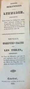 Ouvrage rarissime, destiné aux marchands et qui offre un tarif des monnaies employées à l'époque dans le commerce des toiles, ainsi que la concordance des mètres des Pays-Bas avec les aunes de Gand et de Courtrai.