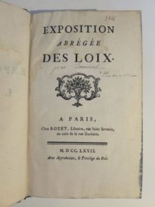 [DAMOURS (Louis)]. Exposition abrégée des loix. A Paris, chez Rozet, 1767. In-8, [2] f., 244 p., …