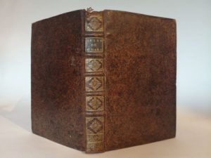 DU PUYS DE LA SERRA (Jacques). L'art des lettres de change suivant l'usage des plus célèbres places de l'Europe. A Paris, chez l'auteur, et A. Warin, 1690. In-8, [10] f., 358 p., [1] f. blanc, veau brun moucheté époque, dos à 5 nerfs, titre doré, caissons ornés, roulette dorée aux coupes, tranches jaspées (coiffe de tête arrachée, accroc à la coiffe de queue, 2 coins émoussés, forte mouillure dans la marge de tête).