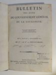Premier volume de cette publication qui entérine l'autorité du Duc de Tarente en tant que gouverneur-général de la Catalogne. Elle prendra fin le 28 septembre 1811 après la parution du 19e bulletin.