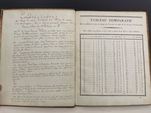 Le volume contient également 2 pages manuscrites : 1. Extrait de la loi du 17 floréal An 7, à propos de la manière de compter les pièces de monnaies d'or et d'argent, dans les caisses publiques et le commerce. - 2. Mesures agraires : réduction des anciennes mesures en nouvelles (un tableau).