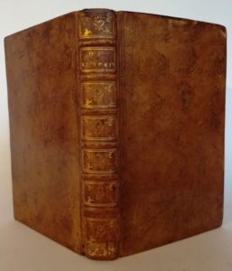 [HELVETIUS (Claude Adrien)]. De l'esprit. À Paris, chez Durand, 1759. In-8, XX-481 p., [1] f. (privil.), veau fauve moucheté et glacé époque, dos à 6 nerfs, pièce de titre basane havane, caissons ornés, roulette dorée aux coupes, tranches rouges (coiffe de tête grossièrement restaurée, dos un peu frotté).