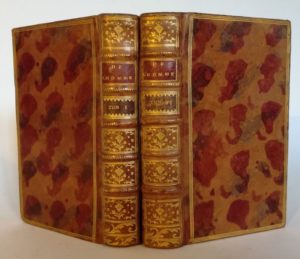 HELVÉTIUS (Claude Adrien). De l'homme, de ses facultés intellectuelles, et de son éducation. À Londres, chez la Société typographique, 1773. 2 vol. in-12, XLIII-399 p. + [2] f., 495 p., veau écaille de l'époque, dos à 5 nerfs, pièce de titre basane brun-roux, tomaison frappée, caissons ornés, triple filet doré bordant les plats, filet doré aux coupes, tranches marbrées (accroc à une coiffe de queue, 5 coins émoussés ; brunissures).