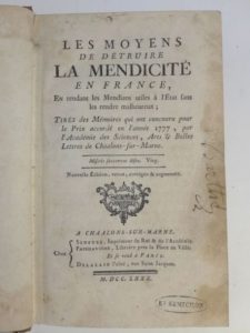 Seconde édition considérablement augmentée, de ce mémoire rédigé dans le cadre d'un concours proposé par l'Académie de Châlons en 1777 sur le thème de la mendicité. La valeur de ce travail fut longtemps soulignée par les spécialistes, « excellent livre, bien supérieur encore à tous les essais tentés de nos jours » (Coquelin & Guillaumin, Dict. de l'économie politique, 1853). L'auteur propose en particulier de privilégier le travail des mendiants, valides ou invalides, au détriment du développement des hôpitaux jugés néfastes.
