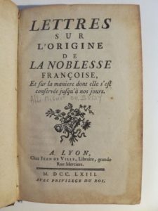 [MIGNOT DE BUSSY (abbé)]. Lettres sur l'origine de la noblesse françoise, et sur la manière dont elle s'est conservée jusqu'à nos jours. A Lyon, chez Jean de Ville,1763. In-8, XXXVI-353 pp., veau fauve marbré, dos lisse et orné, pièce de titre veau grenat, tranches rouges (3 coins frottés, petites fentes au mors sup.).