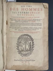 Célèbre traduction de Plutarque donnée par l'humaniste Jacques Amyot (1513-1593). Elle se distingue par une langue dépouillée d'archaïsmes et de latinismes qui ouvrit la voie à un français totalement renouvelé, si bien que l'on surnomma Amyot le Ronsard de la langue française (Cf. En français dans le texte, n° 57). Parue pour la première fois en 1559, cette traduction fit l'objet de 22 éditions jusqu'en 1619 ; celle-ci est illustrée de nombreux petits portraits gravés sur bois dans le texte.