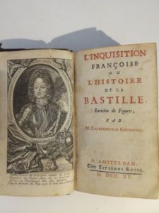 RENNEVILLE (René-Augustin-Constantin de). L'inquisition françoise ou l'Histoire de la Bastille. A Amsterdam, chez E. Roger, 1715. In-12, LXXII-456 p., [4] f. (table), front., pl., veau brun époque, dos à 5 nerfs, pièce de titre maroquin havane, caissons ornés, tranches rouges (coiffes arrachées, coins usés ; brunissures et qq. salissures ; il manque 2 f. : pages 251-254, et sans doute 2 f. blancs à la fin).