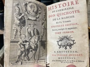 - [CERVANTÈS]. Histoire de l'admirable Don Quichotte de la Manche. A Amsterdam, chez Pierre Humbert, 1735. 6 vol. in-12, basane havane post., pièces de titre rouge, de tomaison vertes, caissons ornés, filet à froid, tranches mouchetées (rel. griffées, accidents à des coiffes ; qq. déchirures sans perte et taches ; des pl. manquantes).