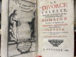 - PALLAVICINO (Ferrante). Le divorce céleste causé par les désordres, & les dissolutions de l'épouse romaine. Et dédié à la simplicité des chrestiens scrupuleux. Avec la vie de l'auteur... Traduit de l'italien Par *** [J. -S. Brodeau d'Oiseville]. A Cologne, s.n., 1696. In-12, front., 175 p., broché, couv. d'attente (grossière restauration touchant le frontispice et la page de titre, un coin mq. en marge du titre).