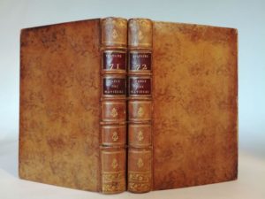 [VOLTAIRE]. CHANTREAU (Pierre-Nicolas). Table analytique et raisonnée des matières contenues dans les soixante-dix volumes des Oeuvres de Voltaire (édition in-8°, dite de Beaumarchais) A Paris, chez Deterville, An IX - 1801. 2 vol. in-8, XI-531 + [2] f., 483 p., veau blond moucheté époque, dos à 5 nerfs, pièces de titre et de tomaison basane grenat, filets, roulettes et fleurons dorés, filet doré aux coupes, tranches marbrées (une coiffe de tête découverte, coins émoussés).