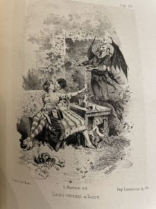 AMERVAL (Eloy d'). La grande diablerie, poème du XVe siècle. Paris, Georges Hurtrel, 1884. In-16, 216 p., fig., pl., demi-basane havane racinée à coins lég. post., dos lisse et orné en long, auteur, titre et date dorés, filet doré aux plats, tête dorée, non rogné.