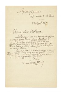 BLOY Léon (1846-1917). Lettre autographe signée, Antony 23 avril 1893, à Paul VERLAINE ;