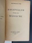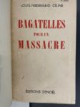 - Bagatelles pour un massacre. Les éditions Denoël, 1937. In-8, 379p. (couv. inclue), couv. et dos conservés (dos conservé restauré et contrecollé, avec lég. manque en queue, auréoles sur la couv. sup., mouillure aux 3 premiers f.).
