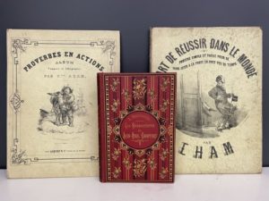 [Caricature]. CHAM (Amédée de Noé, dit). L'art de réussir dans le monde, procédé simple et facile pour se faire jeter à la porte en fort peu de temps. Paris, Maison Martinet, [vers 1850]. In-folio, cartonnage jaune éditeur, dos muet, titre illustré au plat supérieur (dos usé, plats frottés ; rousseurs).