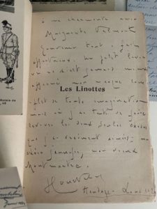 Envoi autographe signé de l'auteur à Marguerite Valmont [sic pour Valmond] où Courteline affirme son "manque complet de toute imagination" pour ce livre et il confesse "[avoir] tenté de faire revivre les deux seuls choses que j'ai vraiment aimées : ma chère jennifer (?), mon vieux Montmartre", situé et daté Hendaye, Août 1924.