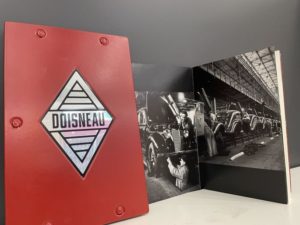 Doisneau - Renault. Paris, Hazan, 1988. In-16, broché, couverture imprimée rempliée, emboîtage riveté en fer laqué rouge, les plats à décor d'une plaque miroir laquée noire en forme du logo de la marque et portant le nom de l'artiste (frottements).