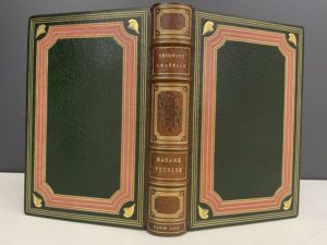 JULIAN-DAMAZY. ERCKMANN-CHATRIAN. Madame Thérèse. Paris, Carteret, 1925. In-8, maroquin vert, dos à 4 nerfs saillants, auteur, titre, lieu et date dorés, caissons ornés de filets dorés et listel mosaïqué, faisceau de licteur et branche d'olivier frappés au centre, encadrement mosaïqué vieux-rose aux plats, avec filets et pointillés dorés, bonnets phrygiens en fleurons angulaires, contreplats bordés de maroquin avec listel mosaïqué, double filet doré aux coupes, tête dorée, couv. et dos conservés, étui [H. Blanchetière] (dos uniformément passé).