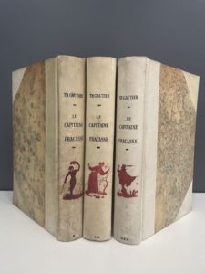 TOUCHET. GAUTIER (Théophile). Le capitaine Fracasse. Paris, éditions du Rameau d'or, Paul Cotinaud, [1943]. 3 vol. in-8 demi-parchemin à coins à la Bradel, auteur, titre, tomaison et silhouette de personnage peints aux dos, tête dorée, couv. illustrées et dos conservés.