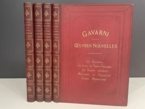 GAVARNI. OEuvres nouvelles. Paris, Librairie Nouvelle, [vers 1853]. Dix-neuf titres en 4 vol. in-folio demi-chagrin rouge de l'éditeur, dos à 5 nerfs, auteur, titre et tomaison dorés, caissons ornés de fleurons, nerfs soulignés de pointillés, les plats en percaline chagrinée rouge, titres dorés aux plats sup., tranches dorées (des coins émoussés, rousseurs généralement limitées aux marges).