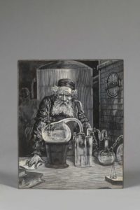 1. Savant barbu, dans un laboratoire, observant du matériel de distillation, dans le goût des illustrations pour les oeuvres de Jules Verne. Env. 15,5?×?13?cm, signé du monogramme PS. 2. Jeune homme vêtu à l'ancienne devant un paysage rural. Env. 10,5× 8,5 cm. Signé MD. Les autres bois sont de diverses dimensions et montrent un sceau, un saint agenouillé, une médaille, une scène biblique incomplète, un parc de château, un alambic.