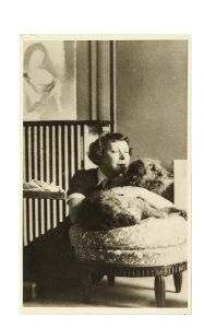 13,5 x 8,5 cm. Jolie photographie de Marie Laurencin chez elle avec son chien, signée et datée au dos : “Marie Laurencin 1932”.