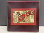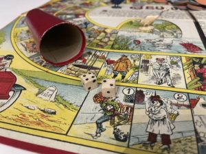 Boite de jeu en carton, contenant un plateau, quatre pions figurant des oies en plomb peint, deux gobelets et une petite boîte en carton, deux dés et des jetons.