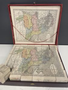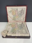 Études géographiques [puzzle]. Jeu composé de 30 cubes en bois couverts de papier chromolithographié et six cartes géographiques figurant la Grèce, l'Espagne, l'Italie, le Royaume-Uni, la Belgique et l'Algérie publiées par Logerot, quai des Augustins, 55.